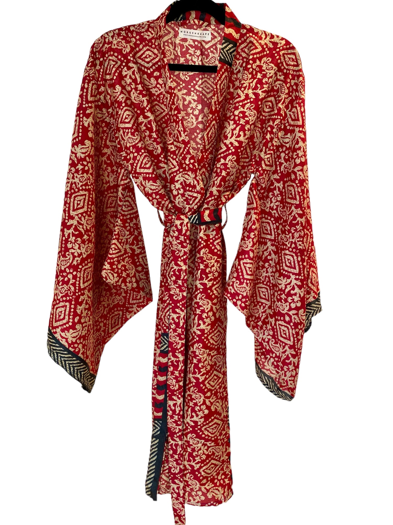 Nydelig håndsydd silke kimono. Dette er en kimono, som er laget av vintage silkestoff som er brukt tidligere, derfor kan det forekomme mindre flekker. Kimonoen er unik, og det finnes kun én av hver modell.