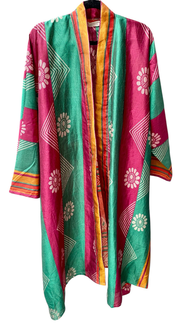 Håndsydd silke kimono. Dette er en kimono, som er laget av vintage silkestoff som er brukt tidligere, derfor kan det forekomme mindre flekker/merker etter bruk. Kimonoen er unik, og det finnes kun én av hver modell.