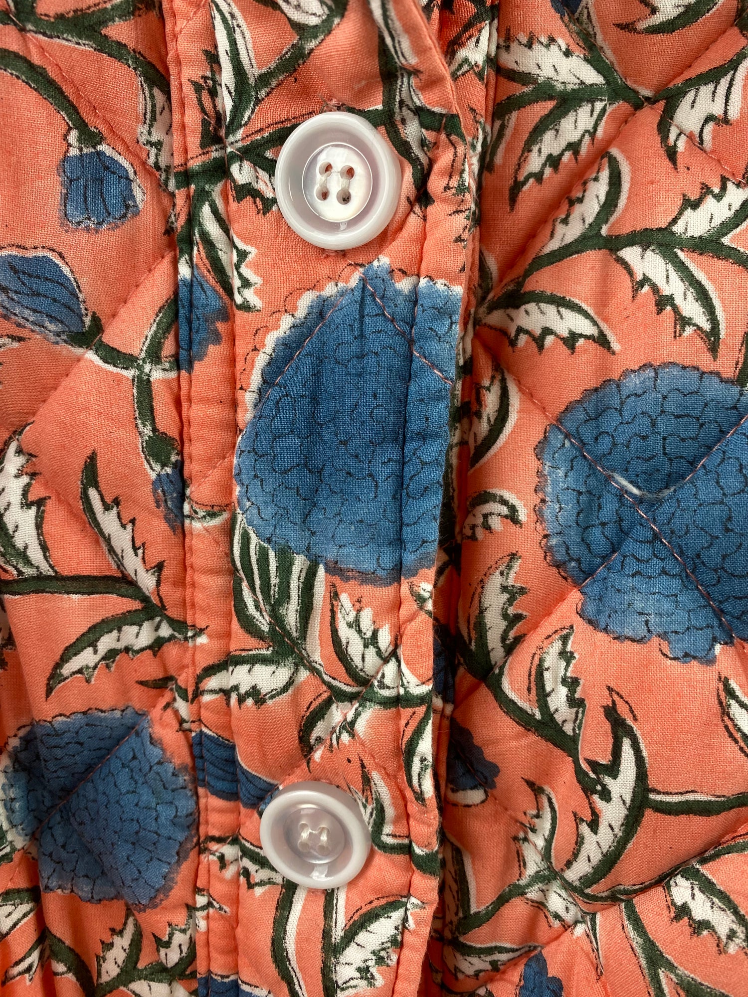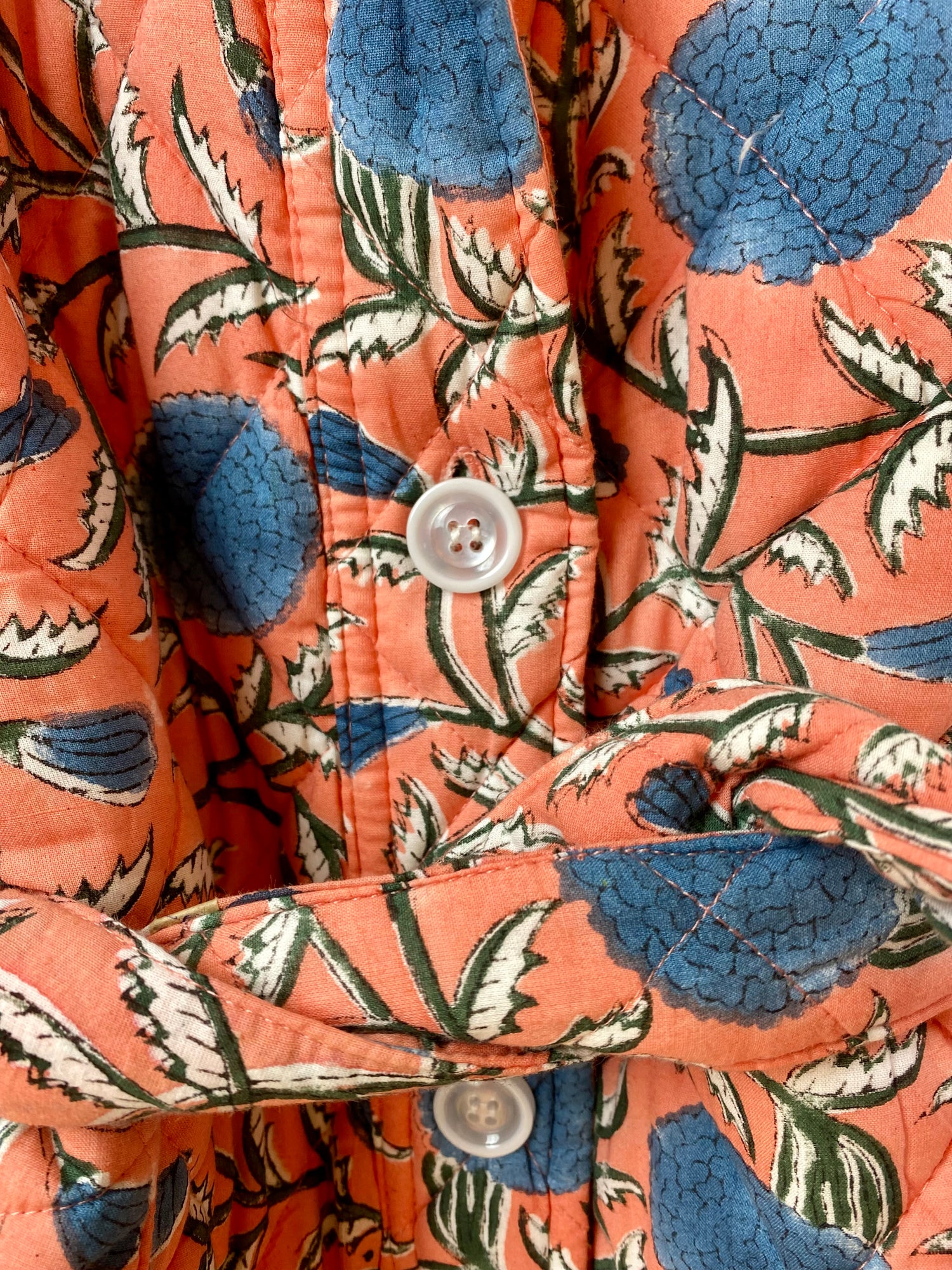 Få antall igjen - Quiltet jakke - Block print - Blå blomstret/fersken