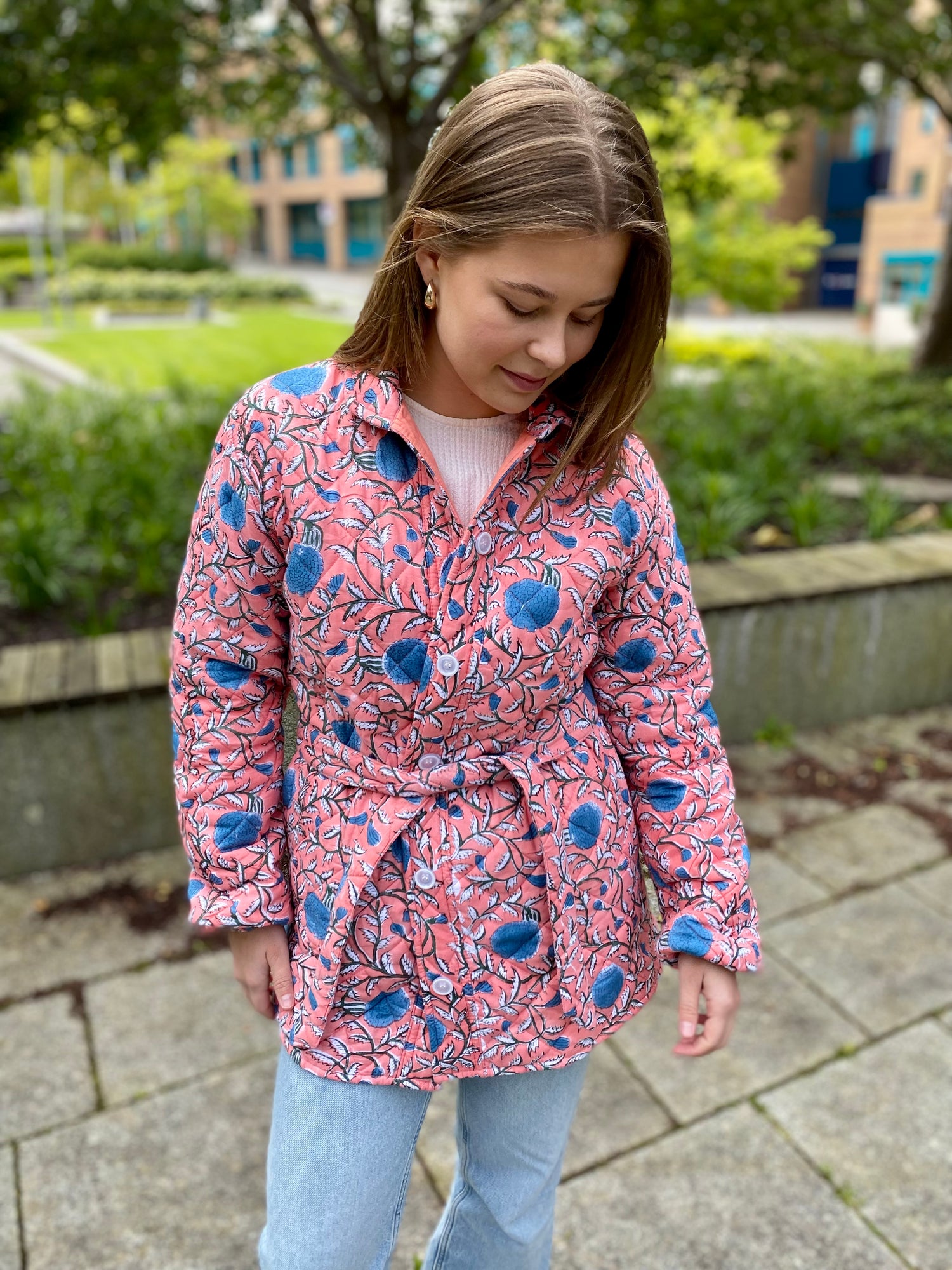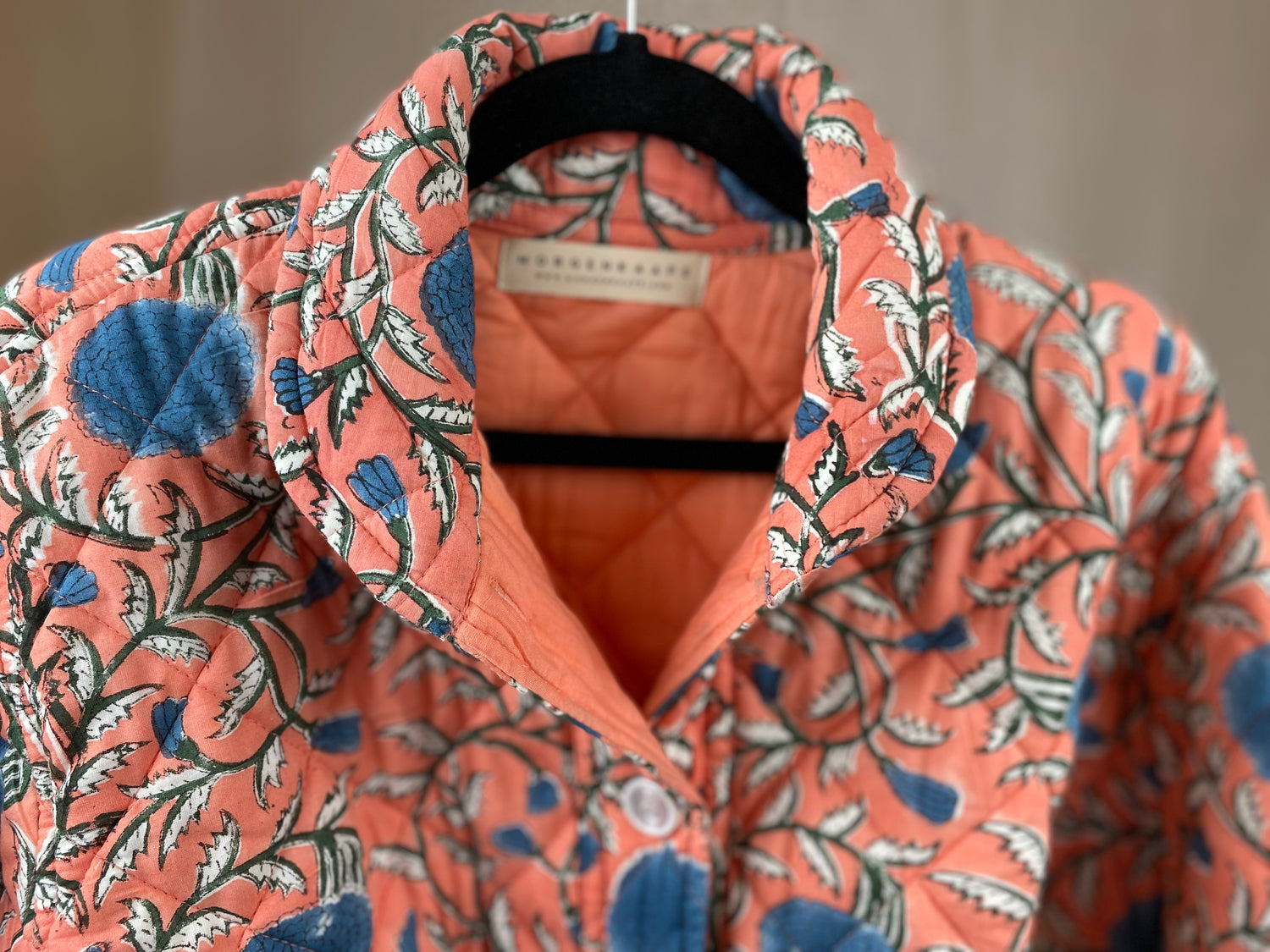 En lun og myk quiltet jakke med håndtrykket blomstermønster (block print teknikk).